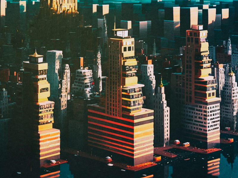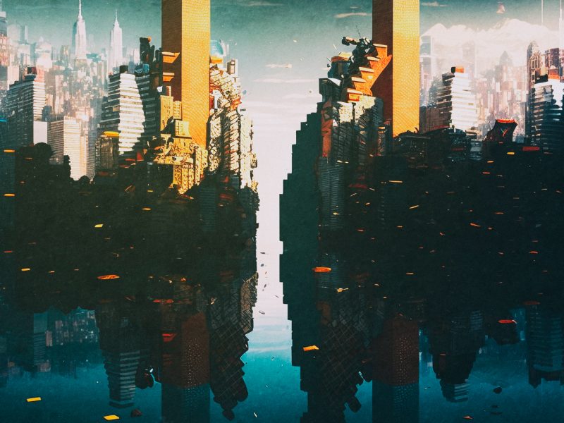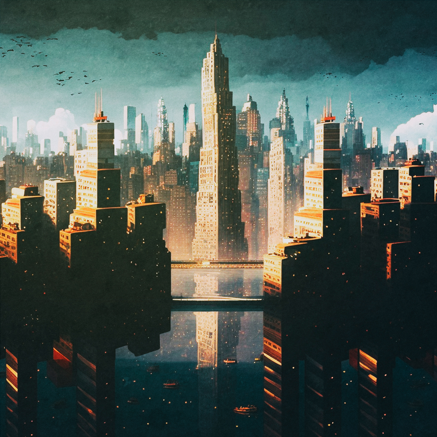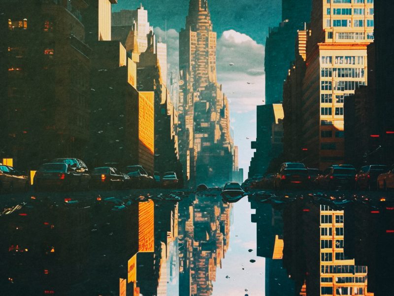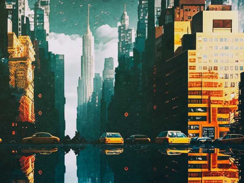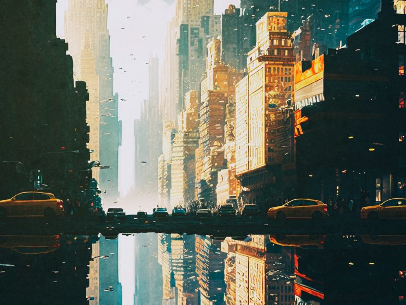 In NewYork 2050, la città simbolo del progresso galleggia su un futuro allagato. Le acque hanno invaso le strade, trasformando l’asfalto in specchi silenziosi, dove i grattacieli si riflettono come monumenti a un’umanità che ha perso il controllo.